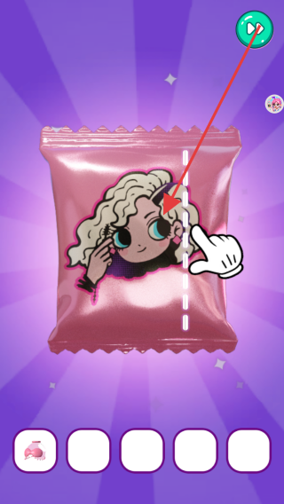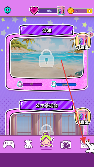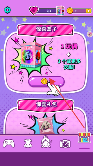 2、在惊喜盒子界面,点击紫色按钮,花费金币打开惊喜盒子,可获得1个玩偶和3个或更多衣服。