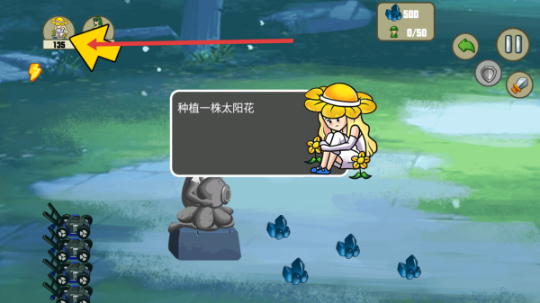 1、到了墓地的场景,首先按照游戏提示种植太阳花,收集阳光资源,为后续种植其他植物和升级植物提供能量。