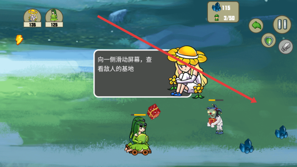 2、在游戏中注意收集蓝色水晶资源,继续向一侧滑动屏幕,查看敌人基地,用于升级植物和解锁新的植物种类。