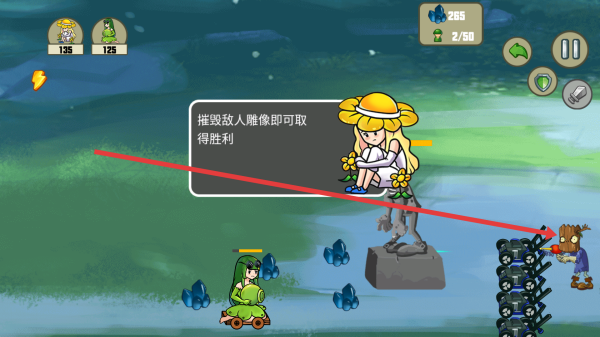 3、在抵御敌人进攻时,根据敌人的类型和数量,合理种植和升级植物,摧毁敌人雕像提高防御能力。