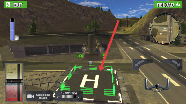 3、驾驶陆军直升机,操控它平稳的降落在标有H的绿色停机坪上,完成系统发布的起降任务。