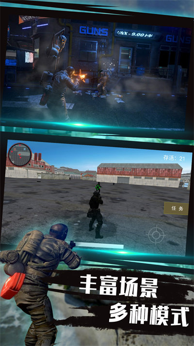 1、动态战场:精心设计的城市废墟、军事基地等多元场景采用随机生成机制,玩家需要根据实时战场情况灵活调整作战策略。
