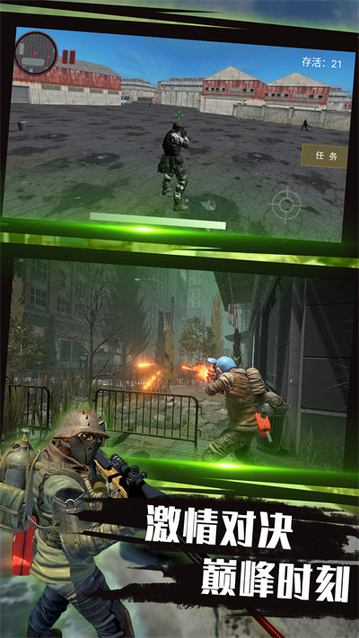 枪火纷争战场将沉浸式射击体验与策略生存结合,化身特种兵携带机密情报突破敌军包围。多场景地图支持自由探索,个性化英雄系统搭配成长型任务机制,通过精准操作与战术配合击败对手。动态小地图实时标记敌人位置,武器威力升级系统助力快速清场,最终存活者赢得专属荣耀奖励。