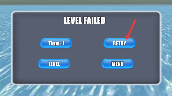 3、若时间到了或者掉入水中则关卡失败,点击RETRY按钮重新挑战,再一次尝试进行通关。