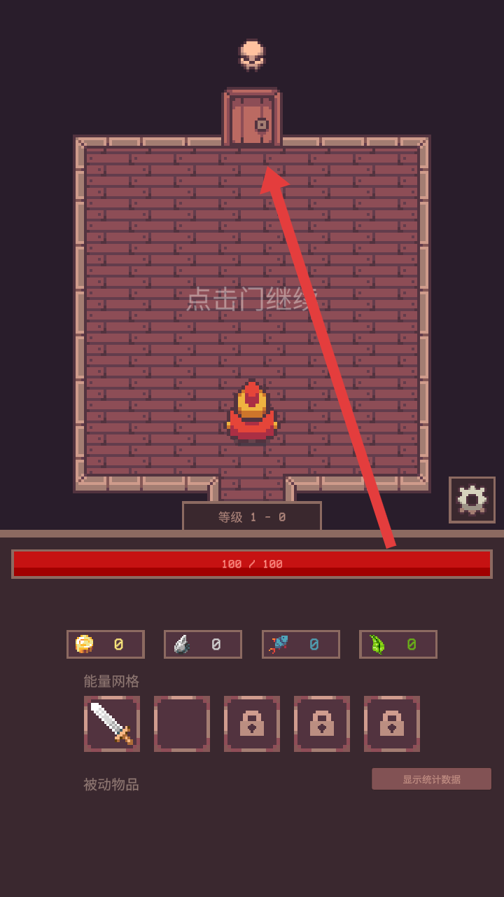 1、需要点击操控游戏角色前往上方的门,进入等级为1的新手冒险关卡,准备开启地牢探索。