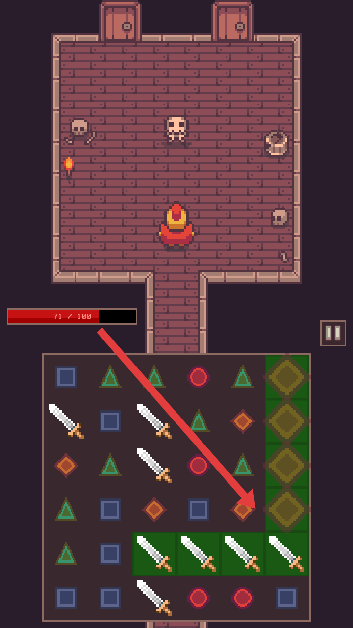 2、在战斗时需要从下方网格选取武器,搭配攻击的阵型,应对场景中的骷髅敌人,尽快击败敌人。