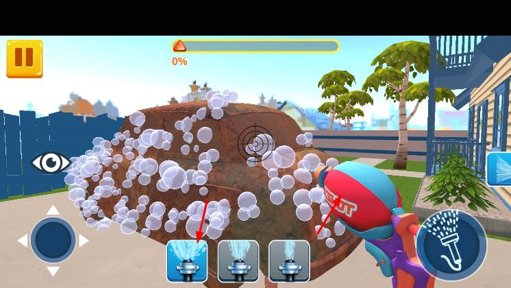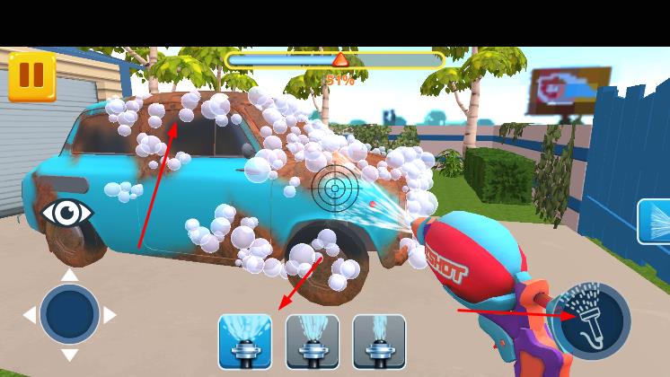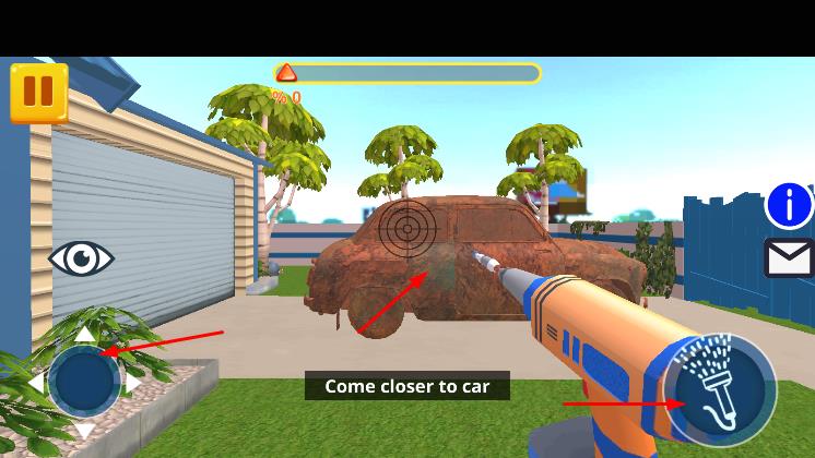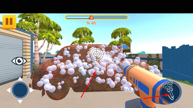 2、通过虚拟摇杆,控制移动靠近汽车,使用水枪,先冲洗车身,按提示调整距离,对有锈迹、污渍的部位重点清洁。