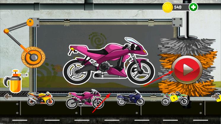 1、进入游戏,在摩托车选择界面点击想要清洗的摩托车,再点击右侧播放按钮开始清洗流程。