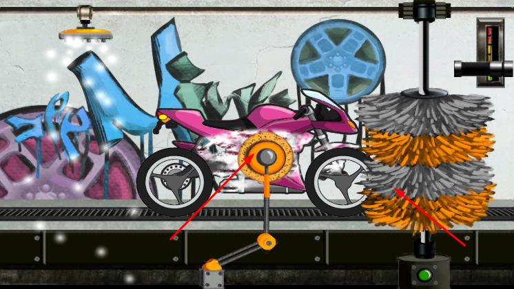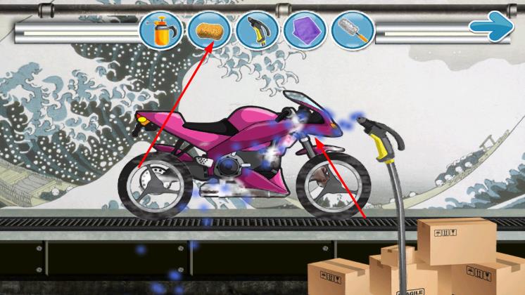 2、在清洗环节,从上方选择不同洗车工具,按照提示对摩托车进行冲洗、擦拭、打磨等操作,去除污渍。
