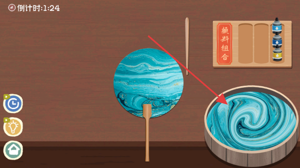 3、在漆扇制作场景中,根据提示将漆扇放入红色箭头所指的颜料池中,进行颜料浸染操作,完成漆扇的制作步骤。
