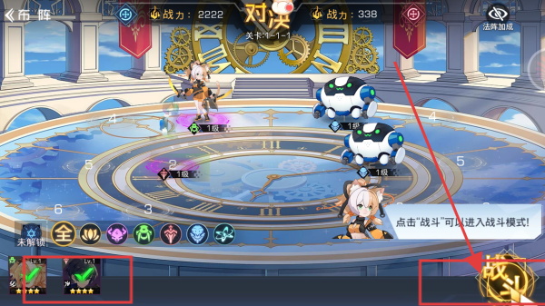 3、在对决界面,选择红色方框内的角色,然后点击右下角的战斗按钮,进入战斗模式,与敌方角色展开对决。