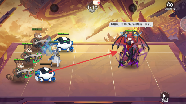2、在游戏战斗场景中,操控我方角色与红色箭头所指的敌方角色进行战斗,根据角色技能和属性,合理安排战斗策略。
