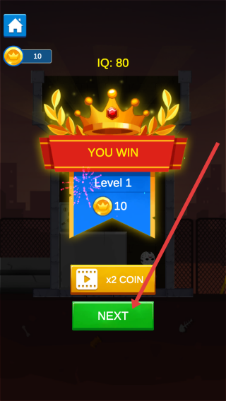 3、成功通关Level-1后,点击绿色NEXT按钮,获取10金币奖励,进入下一关继续挑战。