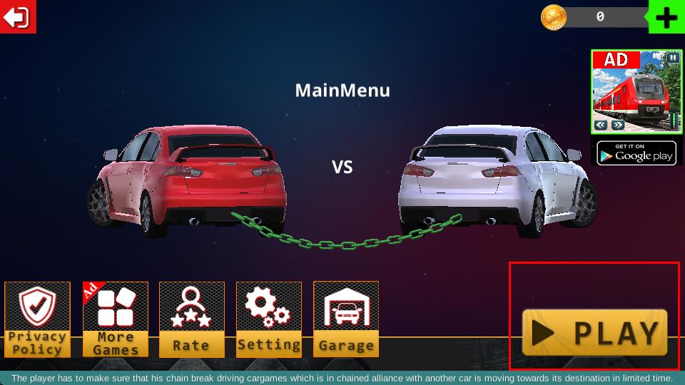 1、进入游戏主界面后点击黄色PLAY按钮,开启锁链连接两车的竞速挑战,迈出游戏第一步。