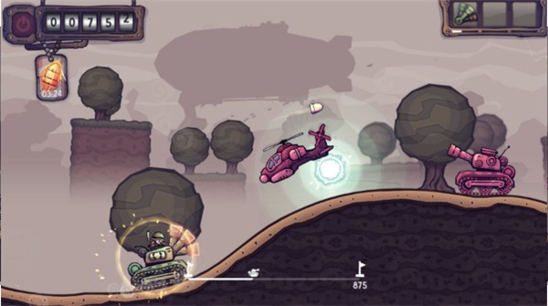 2、夸张的卡通物理效果,炮弹命中时产生绚丽爆炸。坦克受击时的Q版变形动画,为战斗增添趣味视觉体验。