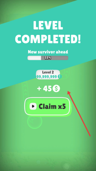 3、完成Level2后可获得奖励,此时New survivor ahead进度达33%,点击Claimx5还能翻倍奖励,为后续关卡储备资金。