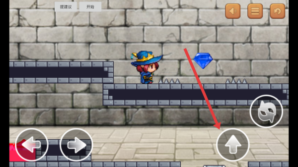 3、当在第1关的游玩场景中,操控界面下方的虚拟方向与跳跃按键,指引角色精准跳跃,巧妙避开危险尖刺,同时尝试朝着蓝色钻石道具所在位置探索。