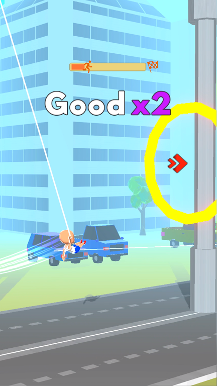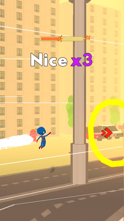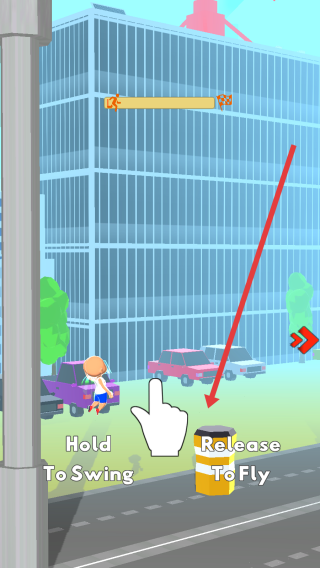 2、游戏中按住屏幕使角色借助道具摆动,松开释放后让角色飞向空中,完成跳跃操作。