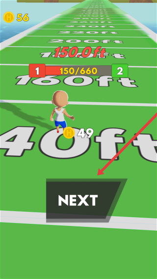 3、在跑道关卡结束后,点击绿色跑道上的NEXT按钮,获取金币奖励并进入下一关挑战。