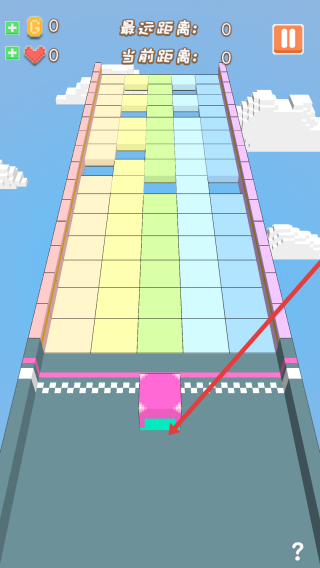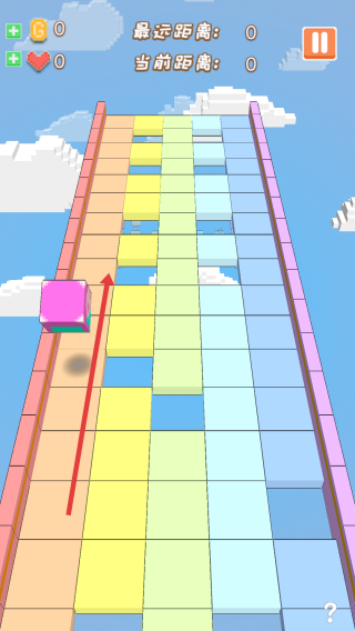 1、开始跑酷的页面时,方块会自动向前移动,玩家需要通过左右滑动屏幕来控制方块的移动方向,躲避跑道上的缺口等障碍物。