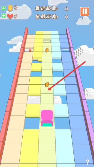 2、在前进过程中,需要留意跑道上出现的金币,操控粉色方块靠近并收集这些道具,可用于解锁新方块。