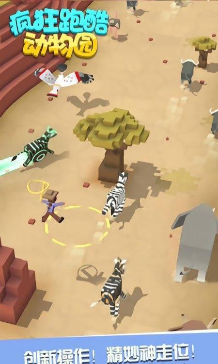 疯狂跑酷动物园是一款融合跑酷与动物园经营的趣味作品,以经典三维像素风格打造精美细腻的画面,玩家将化身为牛仔,在沙凡纳平原上展开跑酷冒险,通过简单操作骑乘马匹、斑马等多种动物,捕捉它们加入自己的动物园,从驯服饲养到经营管理,吸引游客赚取金币,同时体验养殖、模拟、比赛等多样玩法。