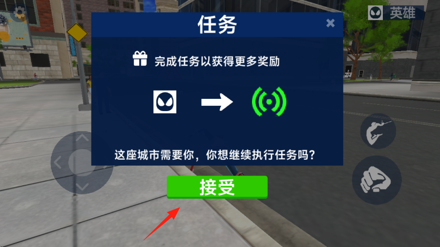 1、进入游戏后,在任务界面,点击箭头指的接受按钮,承接城市任务,开启保卫行动。