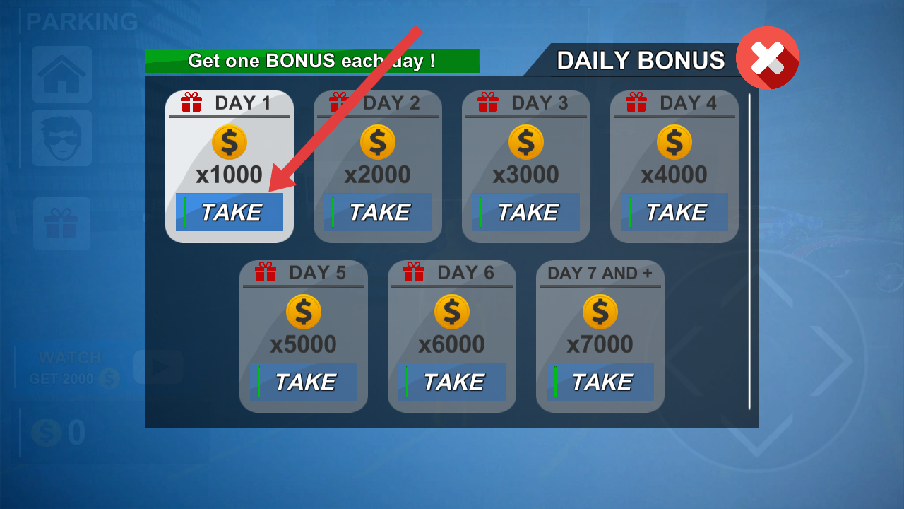 1、进入每日奖励界面,点击DAY1的TAKE按钮,领取1000金币奖励,连续登录可以解锁更高额度奖励。
