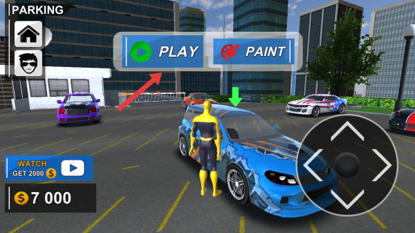 2、在停车场的界面,点击PLAY的按钮,在选定车辆后可以开启游戏挑战,进入驾驶关卡。