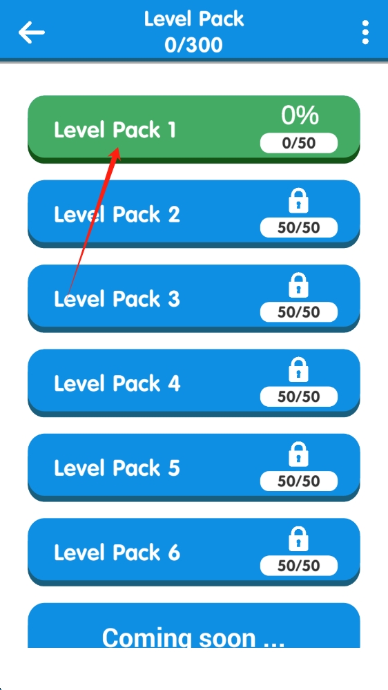 2、进入关卡选择场景,根据箭头提示,选择Level Pack 1,确定游戏关卡,点击选择关卡。