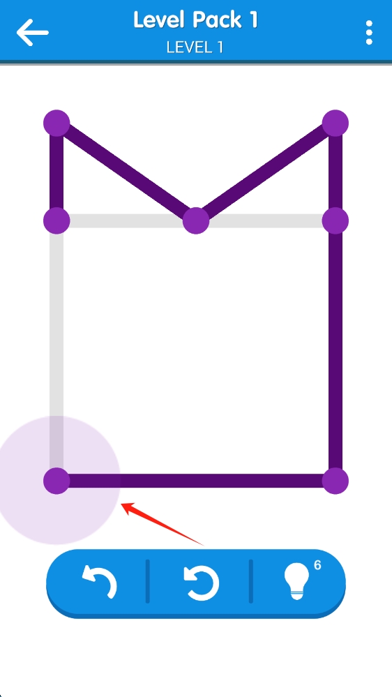 3、在第一关操作场景中,根据箭头提示,进行相应操作,完成一线游戏任务,按住画线。