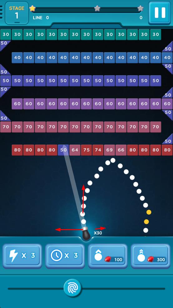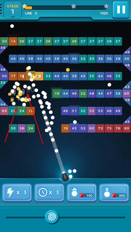 1、发射小球击碎砖块:玩家通过调整角度与力度发射小球,利用反弹原理击碎关卡中的砖块,针对带有数字的砖块,确保射击足够次数将其消灭,直至清空所有砖块完成闯关。