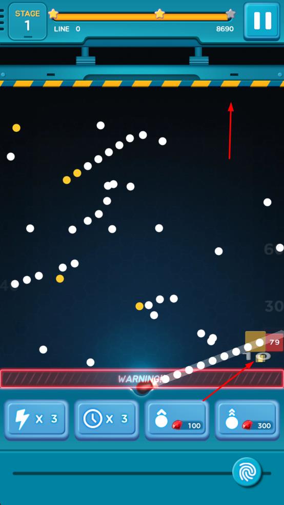 3、留意上方的分数和标识区域,合理利用功能按钮,通过发射小球撞击方块,努力获得更高分数,完成关卡任务。