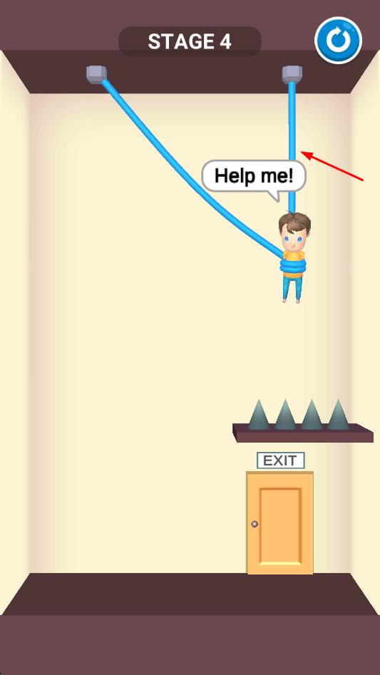 1、进入游戏后观察被吊人类的位置及悬挂绳子的数量与角度,确定首要切割的绳子,准备开始救援操作。