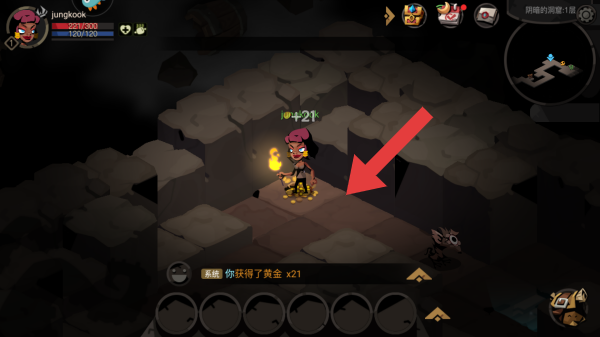 1、在洞穴场景中,需要控制角色移动,前方有敌人在阻碍收集黄金时,需要用刀把它歼灭。
