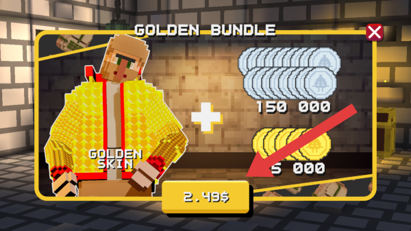 3、这是GOLDENBUNDLE黄金礼包的购买界面,含GOLDENSKIN黄金皮肤及对应金币奖励,价格2.49$。