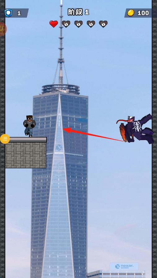 1、阶段1,操控左侧角色,按箭头指向,跳跃跨越gaps,躲避右侧飞行敌人攻击。