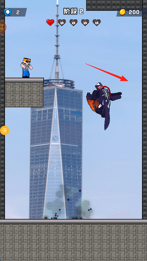 3、阶段2,按箭头指引,操控新角色,跳跃躲避飞行敌人,跨越障碍,收集金币,完成阶段任务。