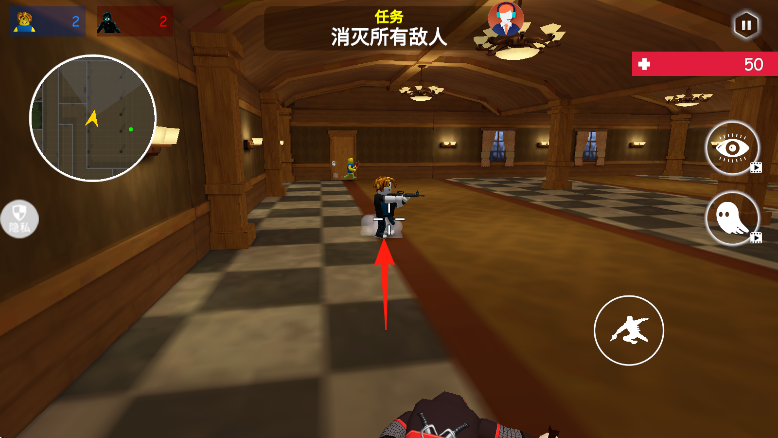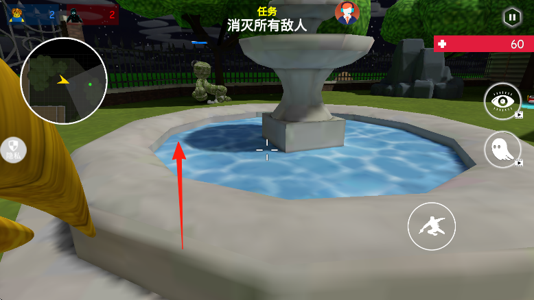 3、继续推进,沿箭头方向,绕到喷泉区域,搜索敌人踪迹,消灭剩余目标,完成关卡。