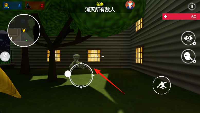2、转移至户外,依据箭头指引,瞄准树旁敌人,射击消灭,完成消灭所有敌人任务目标。