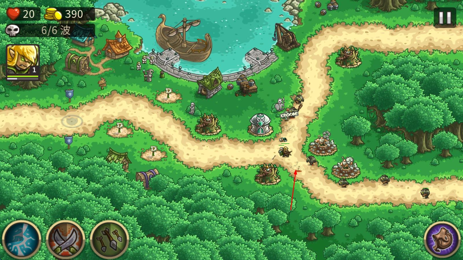 1、进入游戏,熟悉森林等地图布局,选择合适的交战防御位置建造基础防御塔抵御敌人的进攻,了解不同敌人特点,开启守护森林的塔防之战。