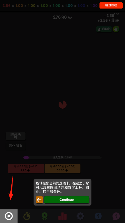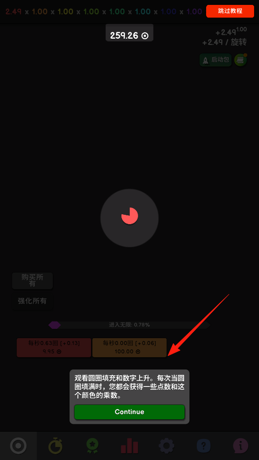 1、进入革命空闲,界面显示圆圈填充与数值说明,点击Continue,继续教程流程,观察圆圈填充进度等待填满获取点数与颜色乘数,利用此机制积累资源体验基础成长玩法。