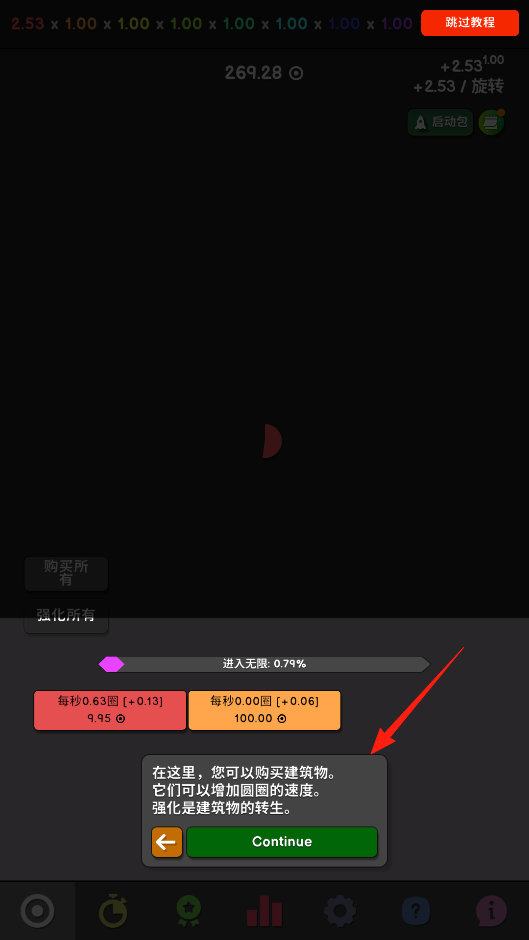 2、出现购买建筑物提示,点击Continue推进教程,后续可购买建筑,提升圆圈填充速度强化建筑实现转生,通过建筑养成加快资源获取体验建筑增益机制。