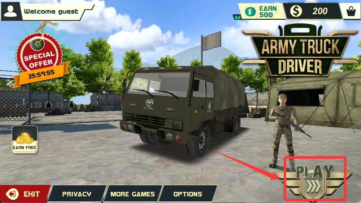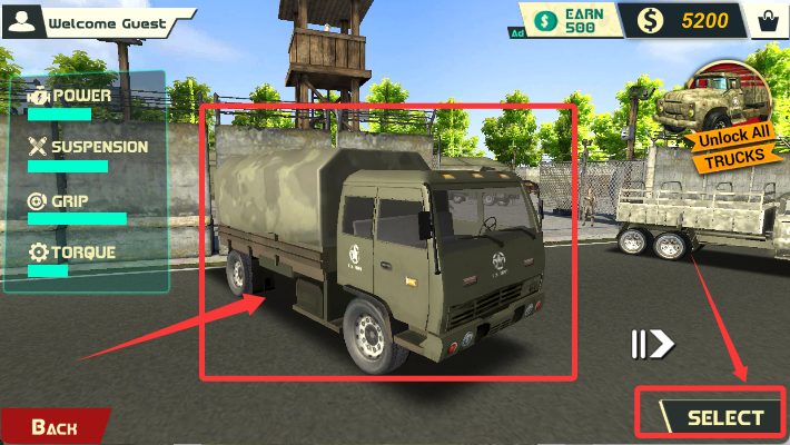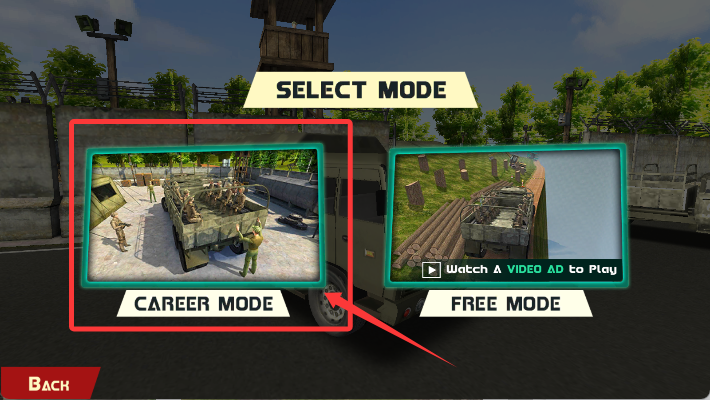 2、从展示列表中选中喜欢的军用卡车,确认选择后跳转至玩法选项。