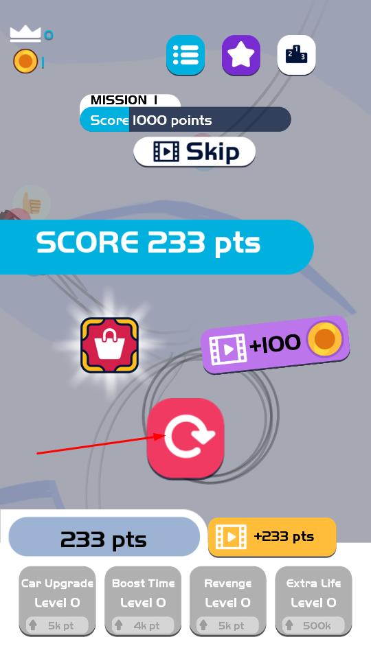 3、结算界面可点击重玩按钮再来一局,或观看广告兑换奖励,利用积分升级车辆属性,解锁更强性能,挑战更高分数。