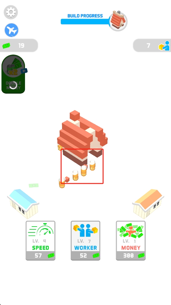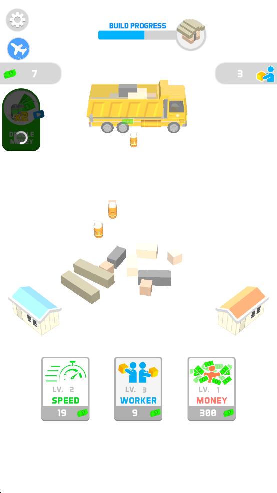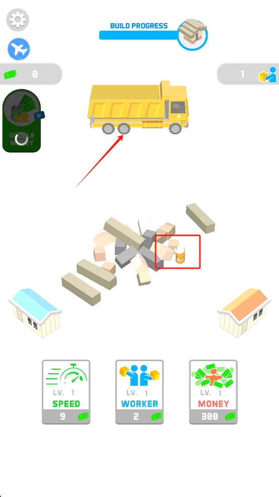 1、点击场景内小人,引导他运输建筑材料,通过积累资源推动BUILD PROGRESS进度条,为房屋建造筹备物资。