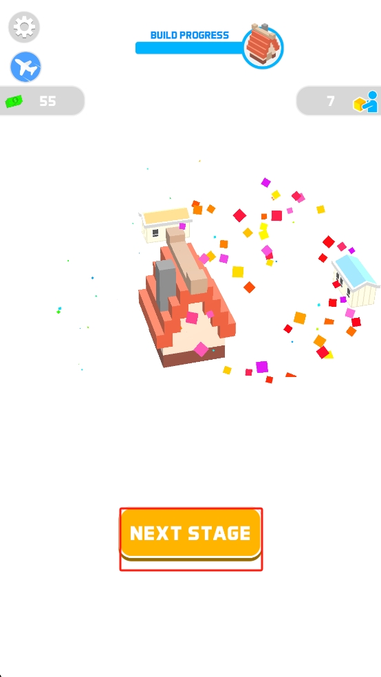 3、房屋建造完成后,点击底部橙色NEXT STAGE按钮,进入下一阶段,挑战更复杂的建筑建造任务,延续城市建设进程。