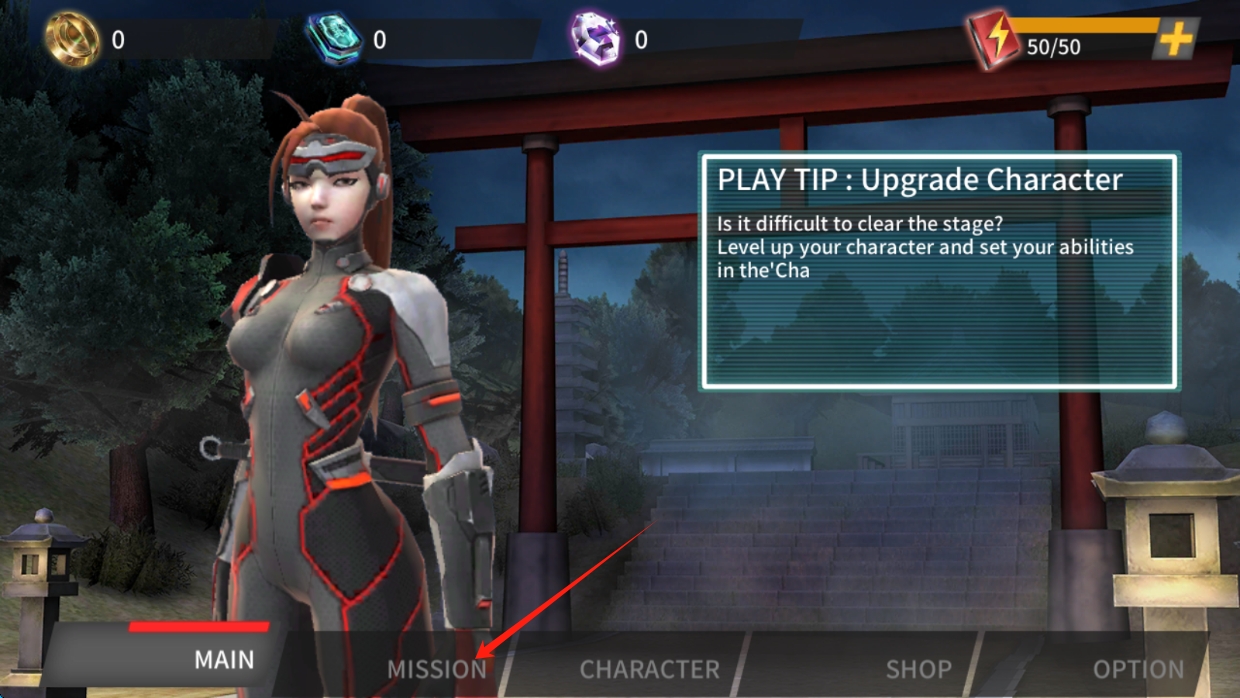 1、在游戏主界面,跟随箭头提示,点击MISSION,进入任务选择界面,点击开始游戏。