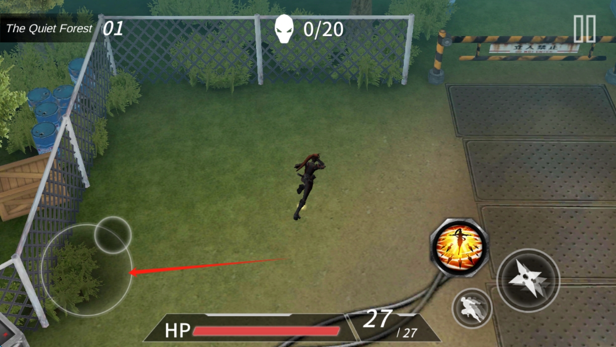 3、在游戏操作场景中,根据箭头提示,利用虚拟摇杆和技能按钮,操控角色,消灭敌人,拨动轮盘移动。