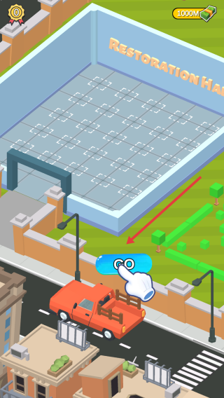 1、进入游戏后,依据提示点击蓝色按钮,将卡车所运物品送入修复大厅,开启收集或修复流程。